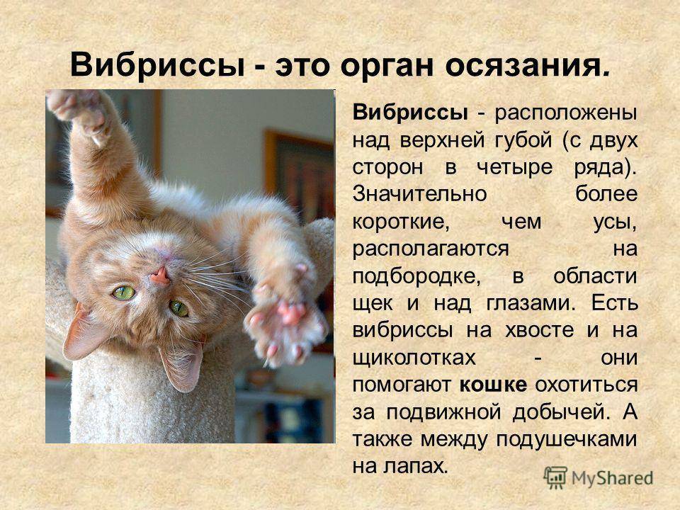 Вибриссы – один из основных органов кошачьего осязания. При этом каждый волосок имеет свою длину и чувствительность. Наиболее длинные усики расположены над верхней губой. Усы средней длины, короткие волоски – в области щёк, нижней губы, на подбородке и над глазами. В нормальном состоянии вибриссы периодически обновляются, выпадают по одному волоску. Это вполне естественный физиологический процесс.