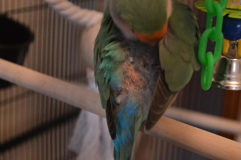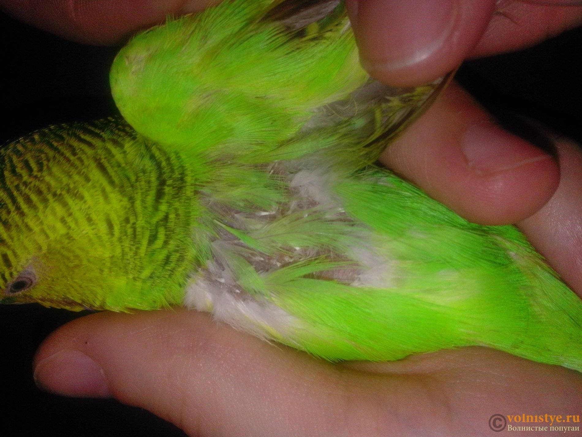 Не редкое явление, когда выпадают перья у волнистого попугая при наличии грибка или клеща. Внимательно осмотрите состояние выпавших перьев. В этих двух случаях на перышках можно увидеть небольшие дырочки или даже кровь. На кожном покрове появляются коросты, язвочки, а также шелушение. Волнистый попугай активно чешется и выщипывает перышки.