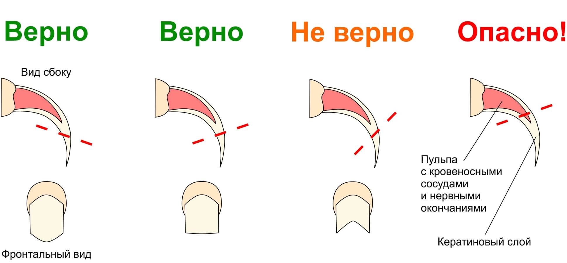 - Быстрыми движениями когтерез устанавливается на 1 мм. до пульпы. Когти состригаются таким образом, чтобы краешек оставался заостренным. В случае неправильно срезанного когтя есть риск повредить пульпу.