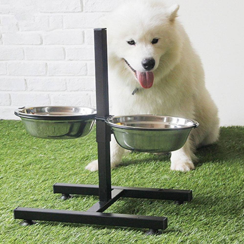 Для сохранения правильной осанки миску располагают на подставке, которая по мере роста щенка увеличивается