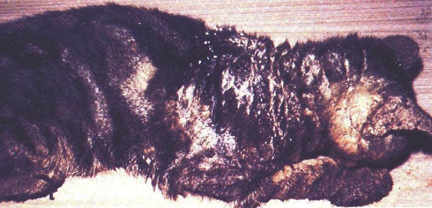 Это наиболее тяжелая форма заболевания, поскольку поражается значительная часть поверхности тела, включая лапы. Кожные покровы становятся складчатыми и неровными. Наблюдаются сильное покраснение и зуд.