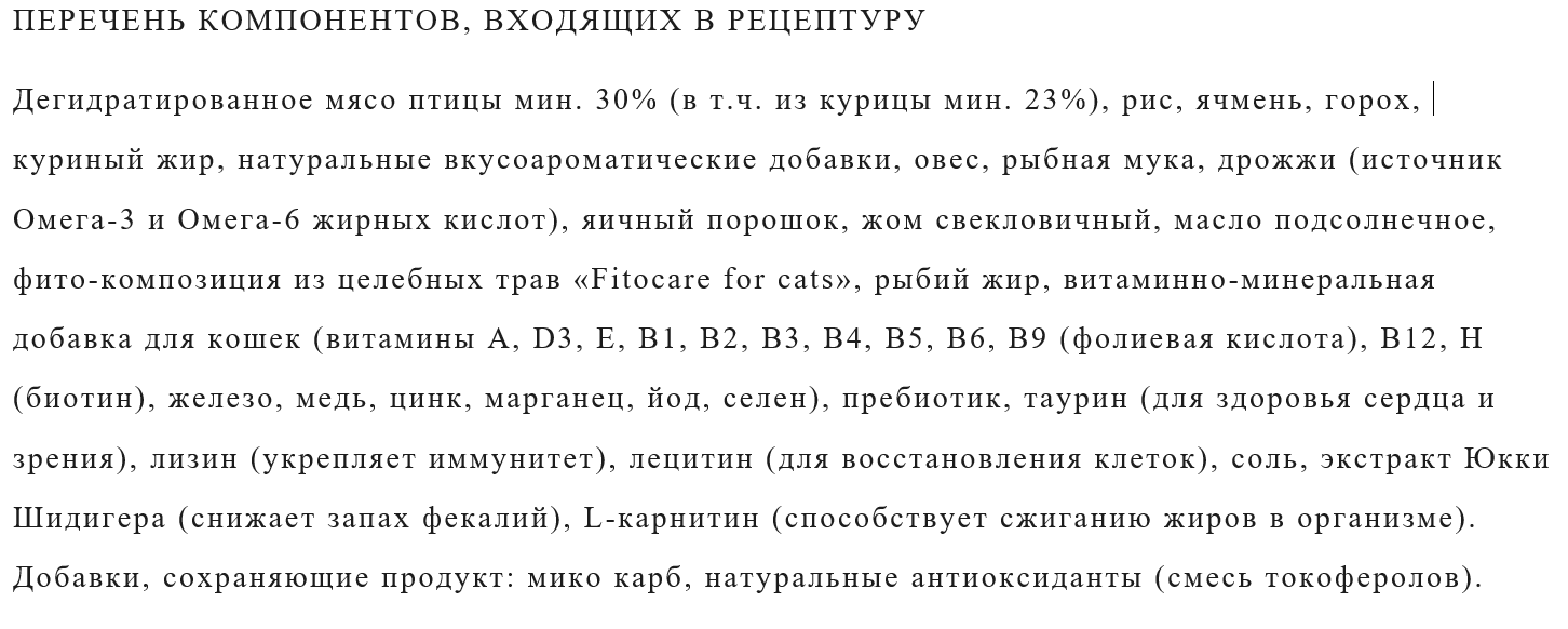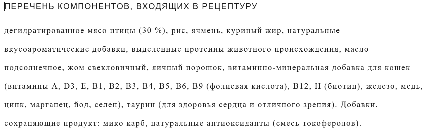 Содержание компонентов корма может отличаться в зависимости от вида и линейки корма. Указанные ингредиенты: