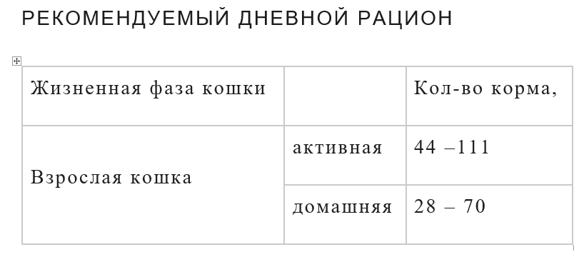 На паучах и пакетах по 400 г есть таблица дневного рациона и рекомендации по кормлению взрослых кошек и котят