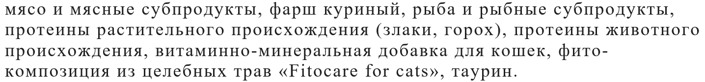 Состав корма подобран так, что удовлетворит потребности кошек в необходимых полезных веществах. Рис благоприятно действует на кишечник, а пищевые волокна облегчают пищеварение и стимулируют моторику кишечника.