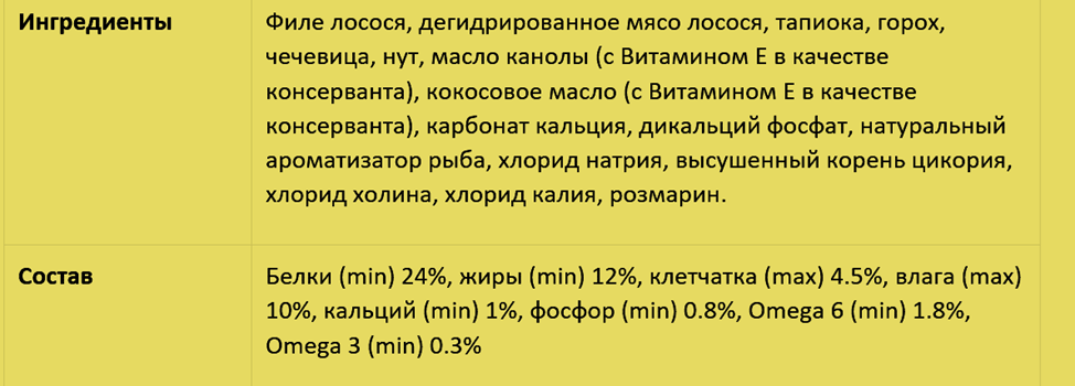 курица 54 % (мясная мука, свежее мясо, куриный жир, натуральный куриный ароматизатор), свежее мясо индейки 10 %, филе форели 10%, картофель, горох чечевица, тапиока, мука из форели, нут, дегидрированные яйца, яблоки, жир лосося, люцерна, филе мяса утки, филе лосося, сладкий картофель, масло канолы, масло кокоса, семя льна, хлорид калия, тыква, морковь, бананы, черника, клюква, брокколи, шпинат, проростки люцерны, черная смородина, кабачок, папайя, гранат, дикальция фосфат, сушеный корень цикория, продукт ферментации грибка Аспергиллы, высушенный продукт ферментации Аспергиллы, хлорид натрия, таурин, сушеный розмарин, экстракт зеленого чая, мята, петрушка, плоды шиповника, цедоария, одуванчик, ромашка, имбирь, фенхель, куркума, ягода можжевельника, лакрица, экстракт календулы, кардамон, гвоздика.