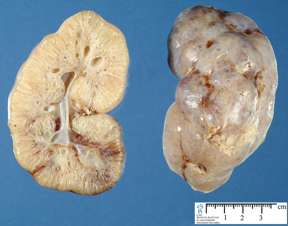 При АРПКП у младенцев обе почки увеличены. По всей паренхиме от мозгового вещества к коре радиально расположены цилиндрические пространства — кисты небольших размеров. Кисты представляют собой расширение собирательных трубочек и сохраняют связь с нефроном. Граница между корковым и мозговым слоем сглажена. При АРПКП всегда имеется разной степени врожденный фиброз печени.