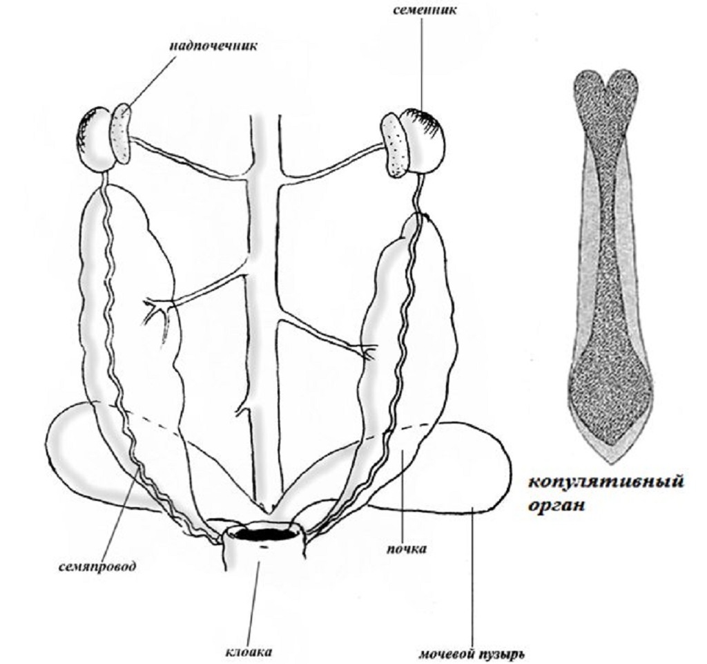 Расположенная в средней части тела, половая система примыкает к почкам. Пока не наступила половая зрелость, она находятся в зачаточном состоянии. Со временем половые органы растут и их размеры значительно увеличиваются. У зрелых особей семенники принимают форму овала иди цилиндра, у молодняка они похожи на небольшое утолщение.