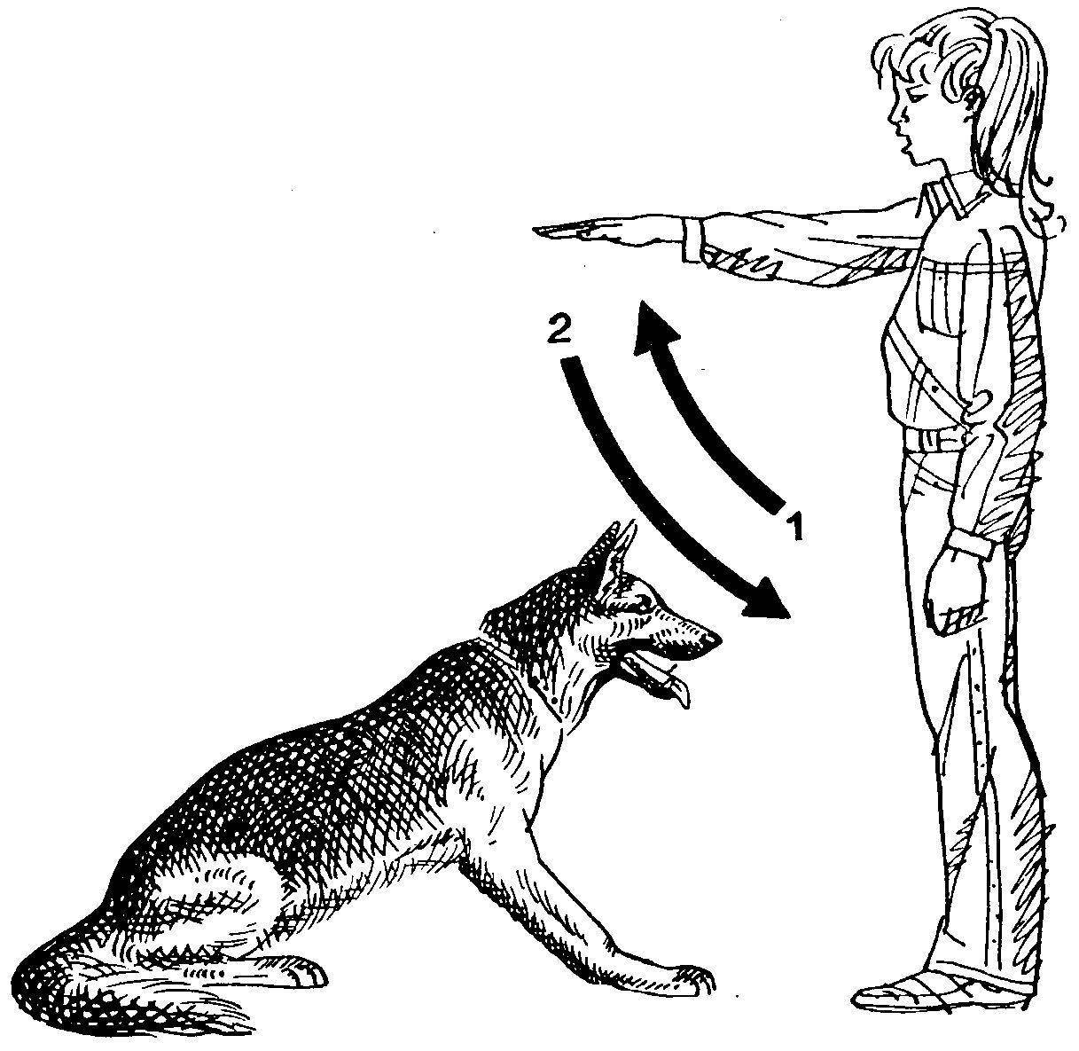 Когда питомец начнет ложиться по команде и терпеливо ждать 5 секунд, то можно вводить дополнительный жест. Жест для команды «Лежать» выглядит следующим образом (см. рисунок) правую руку поднимаете горизонтально, ладонью вперед (1), и опускаете к правому бедру(2). Обучая собаку распознавать жест, постепенно увеличивайте дистанцию до 2-3 метров и выдержку до 7 секунд, больше пока не нужно.