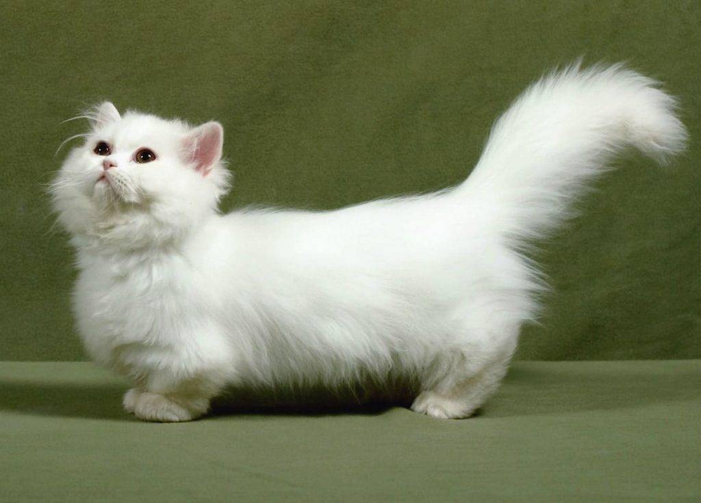 - Длинношерстный манчкин с выделяющимся воротником и плюмажем на хвосте. Эти коротколапые животные имеют шелковистую ость. Под покровным волосом пушистых кошек скрывается среднеразвитый подпушек.