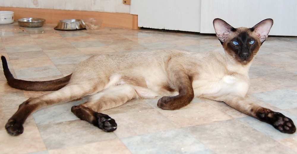 Сиамские кошки – миниатюрные легкие животные с удлиненной клиновидной головой, прямым носом, крупными косо посаженными глазами, большими широкими ушами, высокими тонкими конечностями и длинным хлыстообразным хвостом. У таких кошек между мочкой носа и кончиками ушей должен вырисовываться равносторонний треугольник.