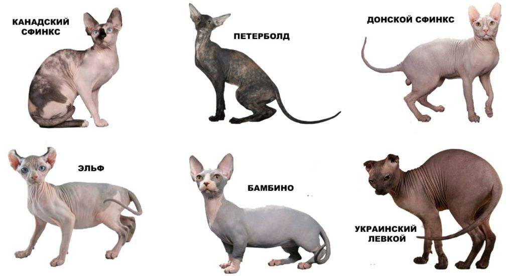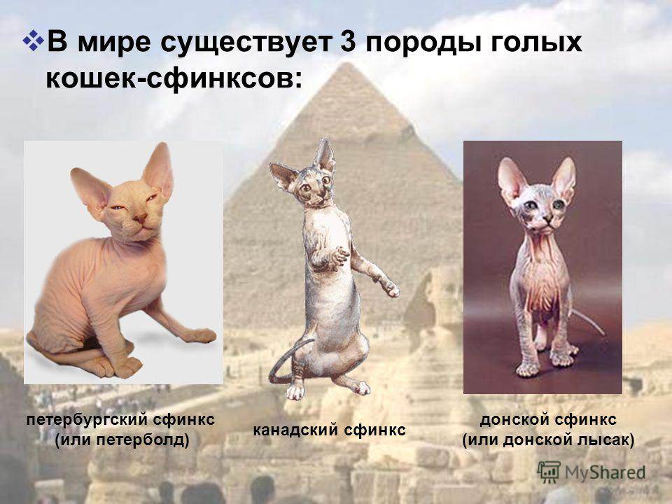 На фото сфинксов довольно сложно отличить друг от друга, но существует несколько подвидов породы: