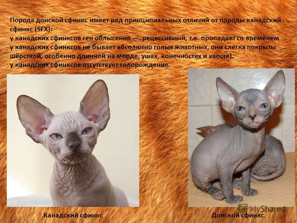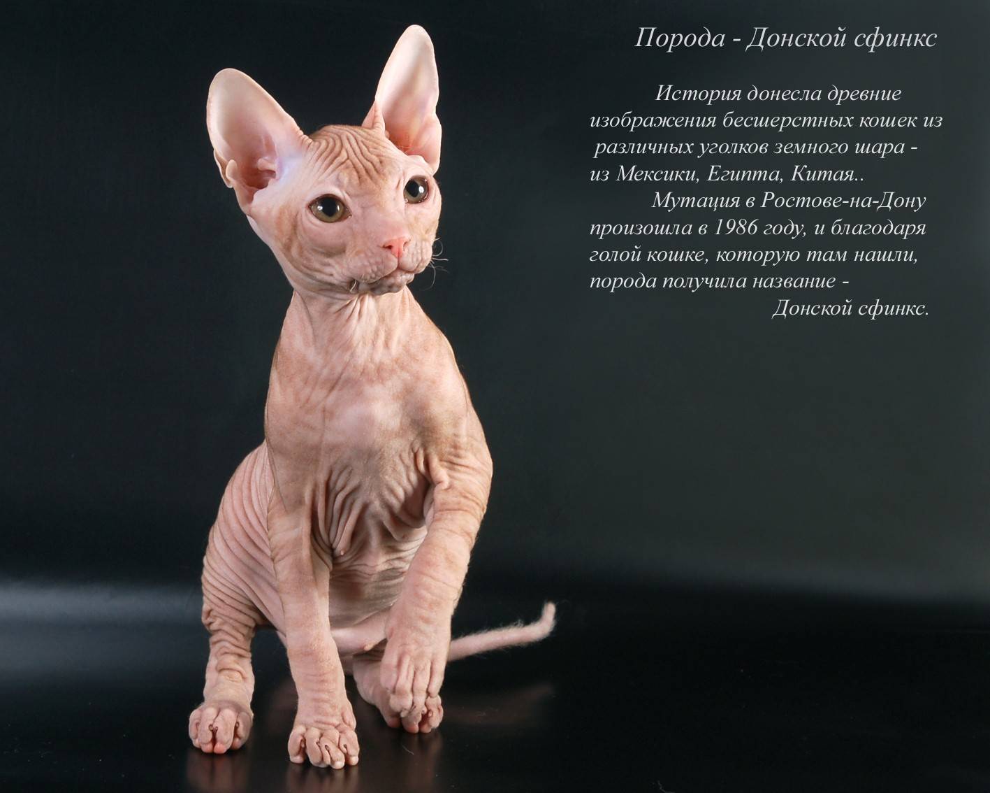 - Донской сфинкс. Представители породы были выведены в Ростове-на-Дону благодаря доминантному гену. Донские сфинксы полностью бесшерстные.