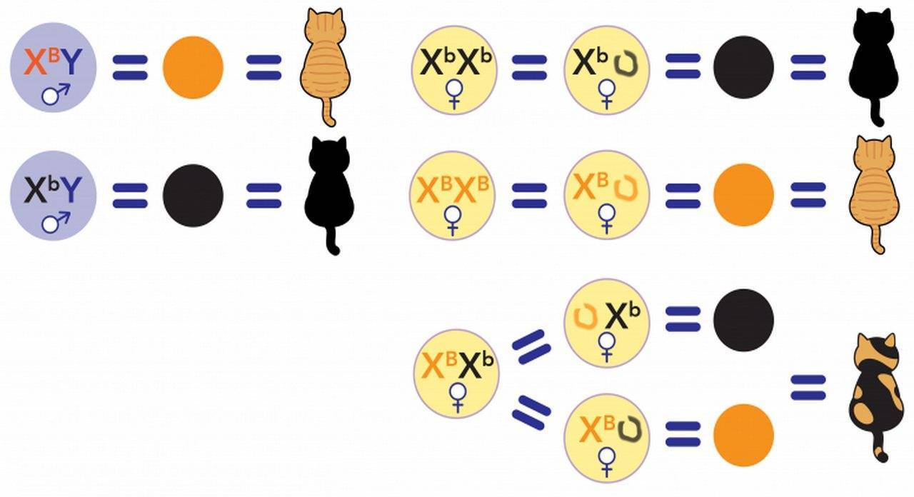 Клетки женских особей кошек, которые, как и другие самки млекопитающих, имеют две Х-хромосомы (XX), претерпевают явление Х-инактивации, при котором одна или другая из Х-хромосом выключается случайным образом в очень раннем развитии. Инактивированная Х называется телом Барра.