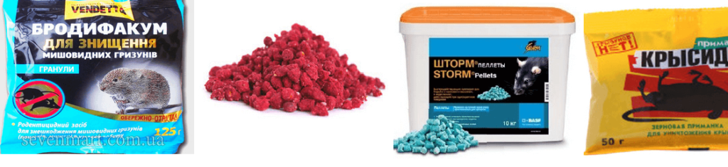 Классическое средство от грызунов – это крысиный яд. С его помощью приманивают вредителей. Основа приманки – зерно. Суть приманки в получении требуемой смертельной дозы для отравления. Форма выпуска яда в виде гранул, таблеток, паст, готовых брикетов.