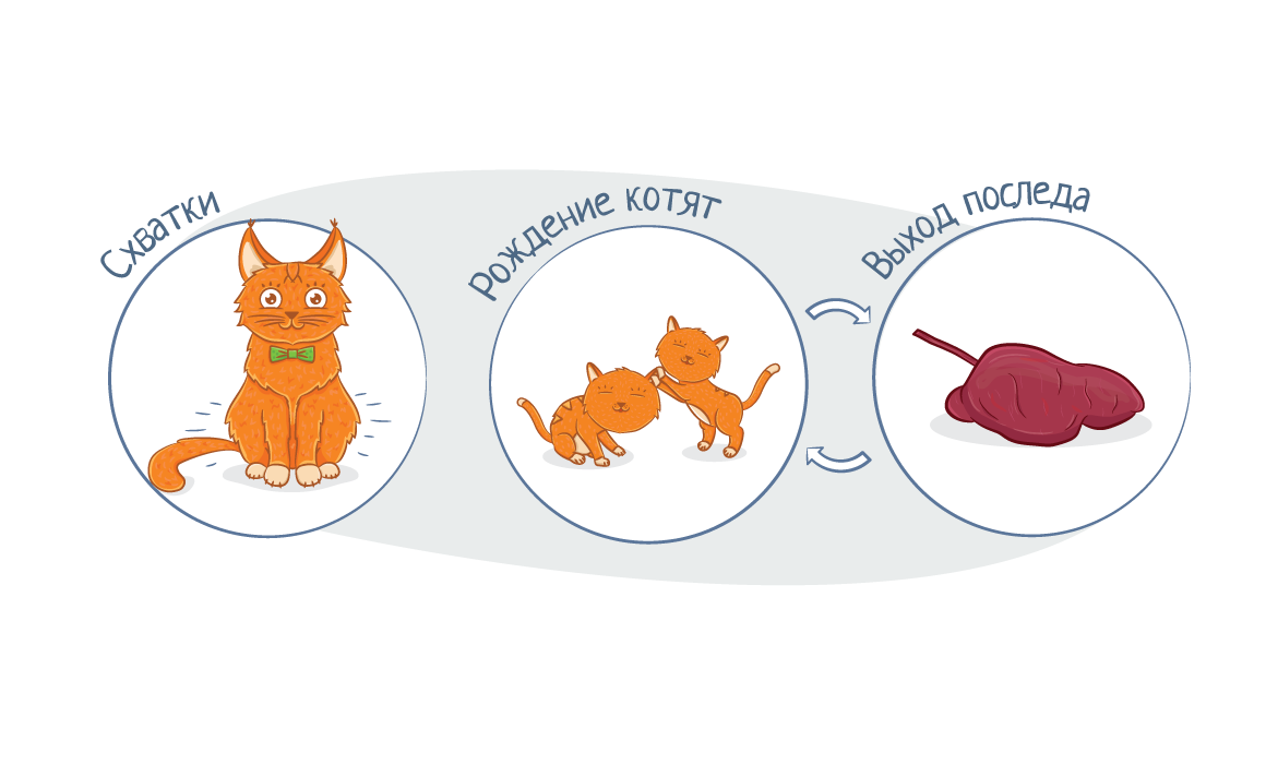 Кошка рожает котят на протяжении 2-4 часов. Дальше продолжается вполне естественный процесс, который не требует никакого человеческого вмешательства. Нет никакой необходимости что-либо делать, ведь на инстинктивном уровне животное должно само принять своё потомство. Мама вылизывает быстро мордочку каждого котенка по мере появления на свет каждого из них, перегрызает пуповину и удаляет амниотические оболочки.