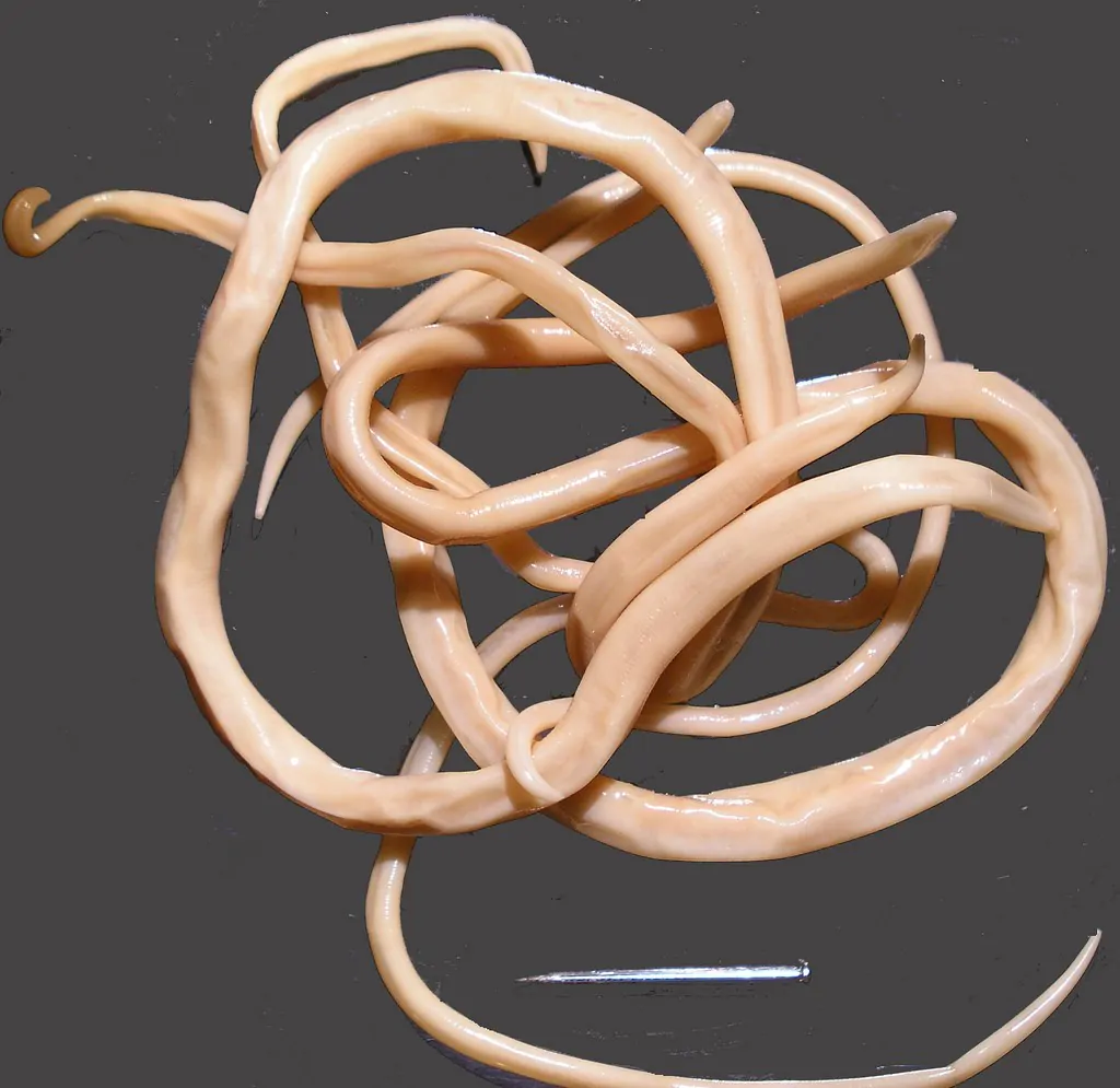 - ancylostoma — небольшие черви (2–3 мм), питающиеся тканями тонкого кишечника и кровью; при заражении развивается анемия, истощение, в фекалиях можно увидеть сгустки крови;