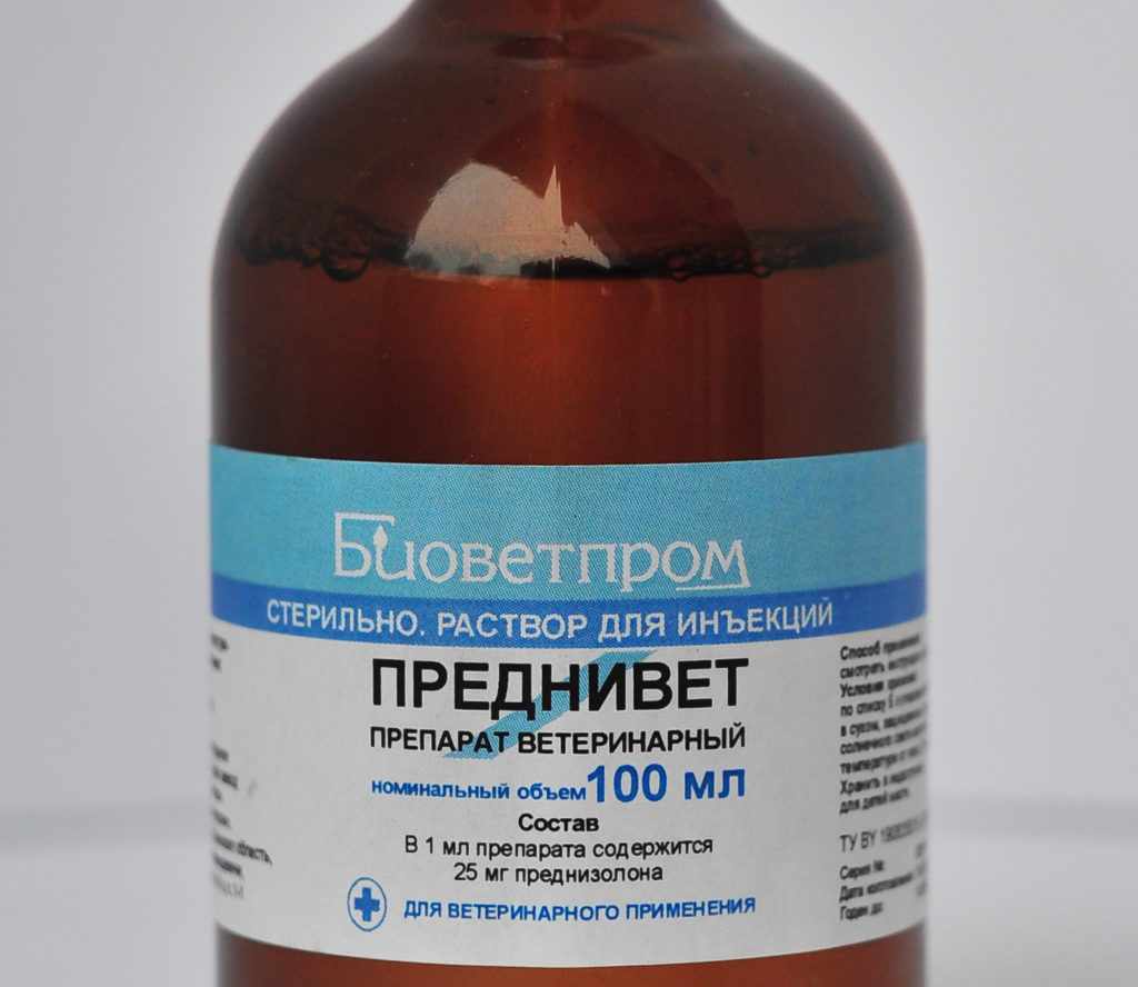 Раствор для инъекций «Преднивет» содержит синтетический глюкокортикостероид в дозировке 0,025 г на 1 мл препарата. В отличие от Преднизолона используется только в ветеринарии – для лечения кошек, собак, крупного и мелкого рогатого скота, свиней и телят. Выпускается в стеклянной таре объемом 10, 20, 50 и 100 мл. Жидкость бесцветная или слегка желтоватая.