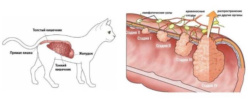 Чаще других у кошек встречается рак кишечника, желудка, рак кожи, крови, рак легких и молочных желез (в основном у пожилых животных). Стадии развития болезни и симптомы В развитии злокачественной опухоли выделяют четыре этапа: