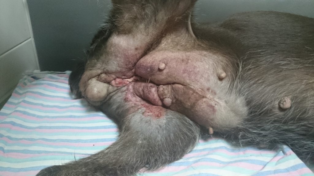 - возникновение шишек, припухлостей на носу, губах, в ротовой полости, в ушах, вблизи молочных желез, в области паха, на подушечках лап.