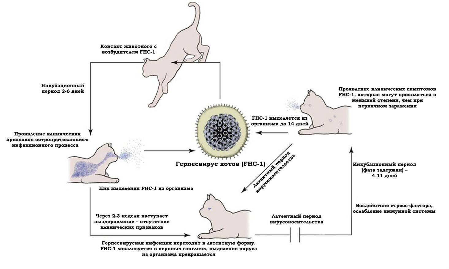 Воротами инфекции, через которые возбудитель проникает в организм, являются слизистые оболочки рта, носа, конъюнктивы. Инкубационный период (с момента заражения до появления первой симптоматики) составляет 2-10 дней. В крови FCV обнаруживается на 3-4-й день.