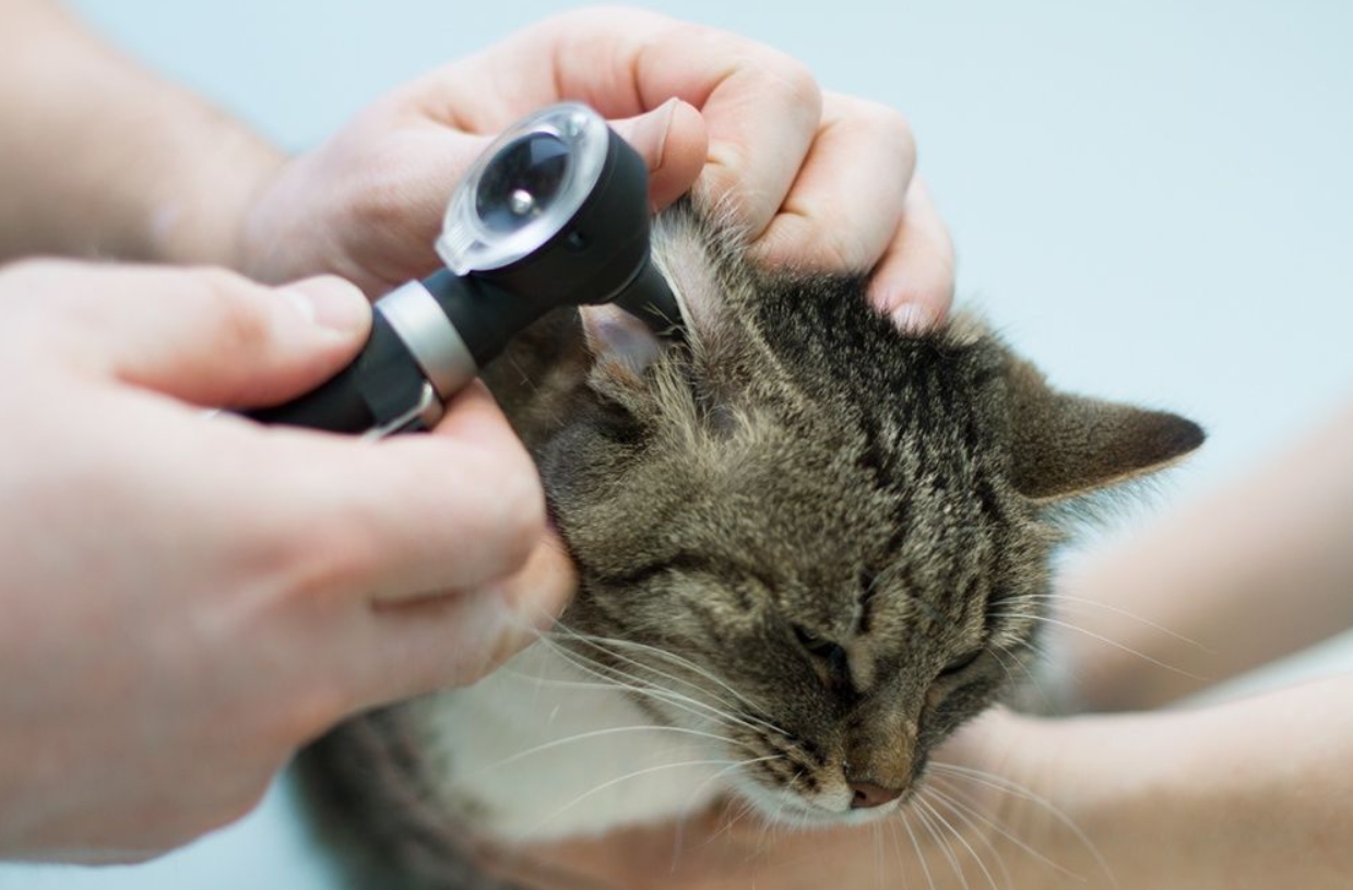 Врач внимательно осматривает ухо животного, обращает внимание на сухие корочки, гнойные ранки, берет соскоб и проводит микроскопическое исследование ушной серы. Под микроскопом видны живые клещ, их личинки и яйца