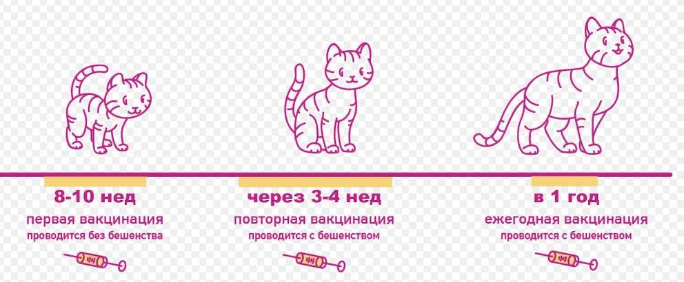 Прививать котят можно уже с 8-10-ти недельного возраста. В двух месячном возрасте малыш уже не получает натитела с материнским молоком, что приводит к ослаблению иммунной защиты. В этом возрасте котята хорошо переносят иммунизацию. Если котик был вакцинирован комплексной вакциной от бешенства в три месяца, ежегодно проводят ревакцинацию тем же ветпрепаратом в год и в дальнейшем питомца необходимо прививать ежегодно. Интервал между ревакцинациями не должен составлять более 12-ти месяцев.