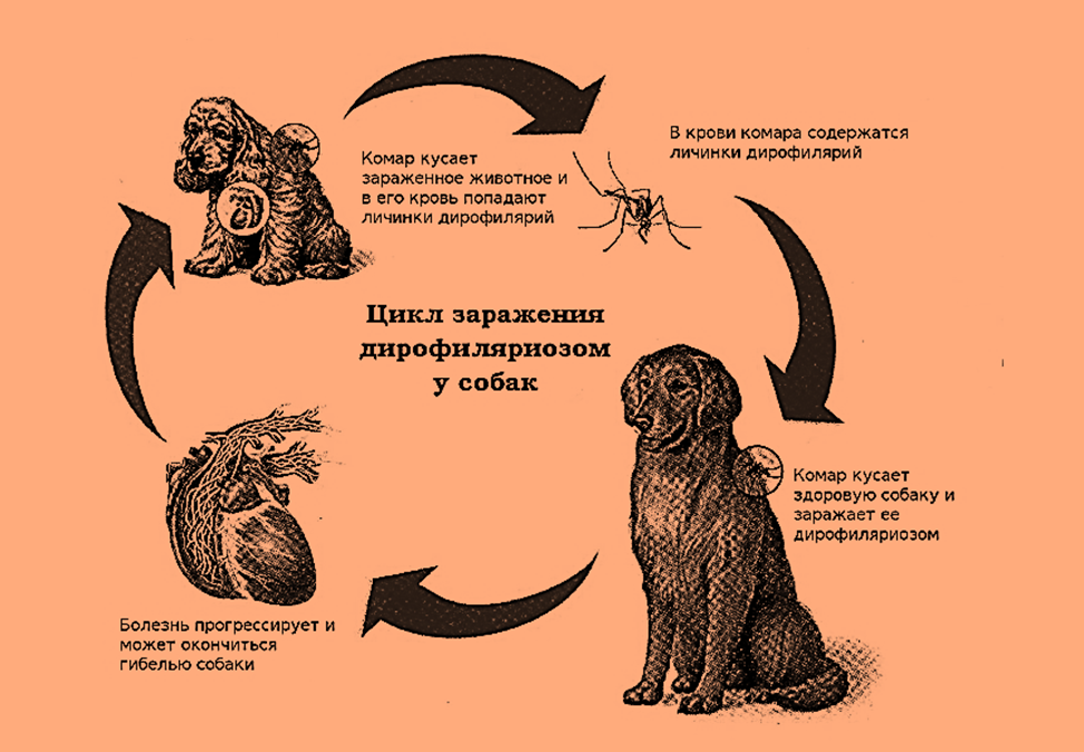 Заражение животного происходит при укусе комара или других кровососущих насекомых — блох, оводов, москитов. В этот момент личинки и попадают в кровь собаки, где развиваются до взрослой особи. Паразитируя в кровеносной системе, дирофилярии вызывают нарушение работы сердца. Это изменение проявляется комплексом симптомов, характерных для сердечно-сосудистых заболеваний.