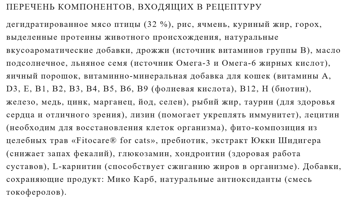 - Дополнительно в нем содержатся рис и ячмень. Эти продукты быстро и беспрепятственно усваиваются кошачьей пищеварительной системой, обеспечивая длительное ощущение сытости.