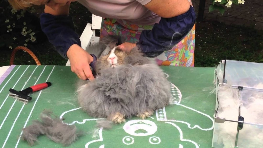 Так как порода ценится шерстью, то и уход за ней должен быть соответствующий. Раз в месяц взрослых особей стригут руками с помощью специальных ножниц. Некоторые заводчики предпочитают выщупывать шерсть. Этот процесс довольно кропотливый и занимает около получаса. Зато считается, что такой пух самый качественный и ценный. Сама процедура ощипывания совершенно безболезненная и не причиняет зверьку никакого дискомфорта. Его просто кладут на колени и аккуратно вынимают пуховую основу из шерсти. Ощипывание стимулирует рост свежего подшерстка. Раз в неделю каждого кролика необходимо расчесывать, чтобы их шерсть не путалась.