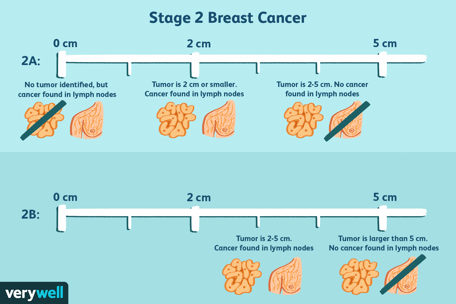- Опухоль достигает 5 сантиметров в диаметре. На этом этапе возможно образование метастаз, которые чаще всего поражают лимфатические узлы, находящиеся рядом с молочными железами;