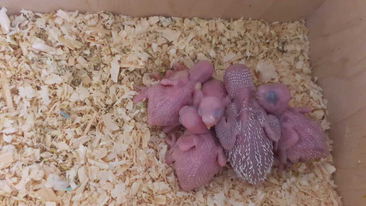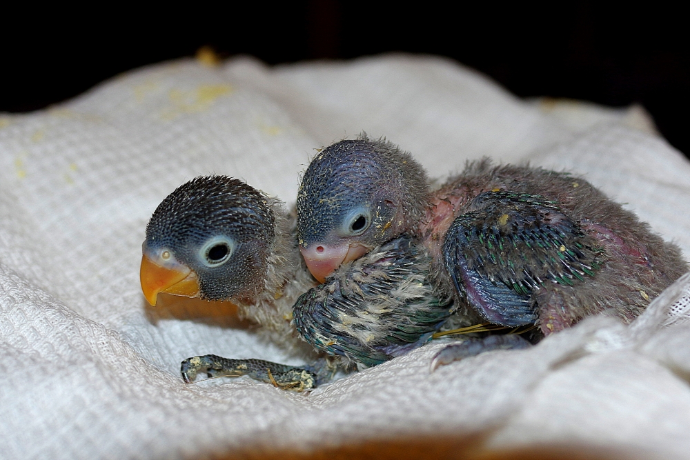 Молодое потомство начинает изнутри клевать яйцо с тупого конца. Изредка происходит ситуация, при которой могут вылупиться близнецы. Через 12 часов после появления первого детеныша весь выводок начинают кормить молодые родителей. Молодые птички слепые и на их теле отсутствует оперение, через неделю перья начинают расти, глаза впервые открываются. Через месяц молодой попугай выглядит как взрослый.