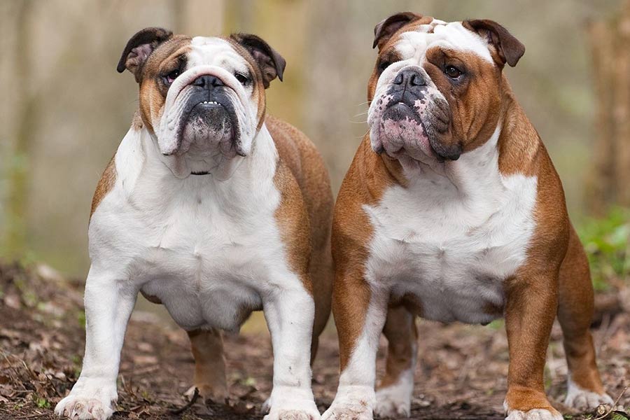 Бульдоги имеют приземистый мощный корпус и развитую мускулатуру, придающие походке уверенность и степенность. Кажется, что животные ходят на кончиках лап. Псов отличают сплющенные морщинистые морды с висячими губами. Бульдоги являются короткошерстными собаками, что облегчает процесс ухода за ними. Окрас однородный или пятнистый. В последнем случае на морде животного должна быть маска черного цвета (подробно смотрите на фото).