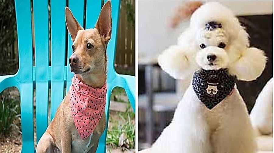 Собираясь шить бандану для собаки, следует тщательно измерить объем шеи питомца. Два обладателя бандан, что на фото ниже, даже на первый взгляд сильно отличаются размерами.