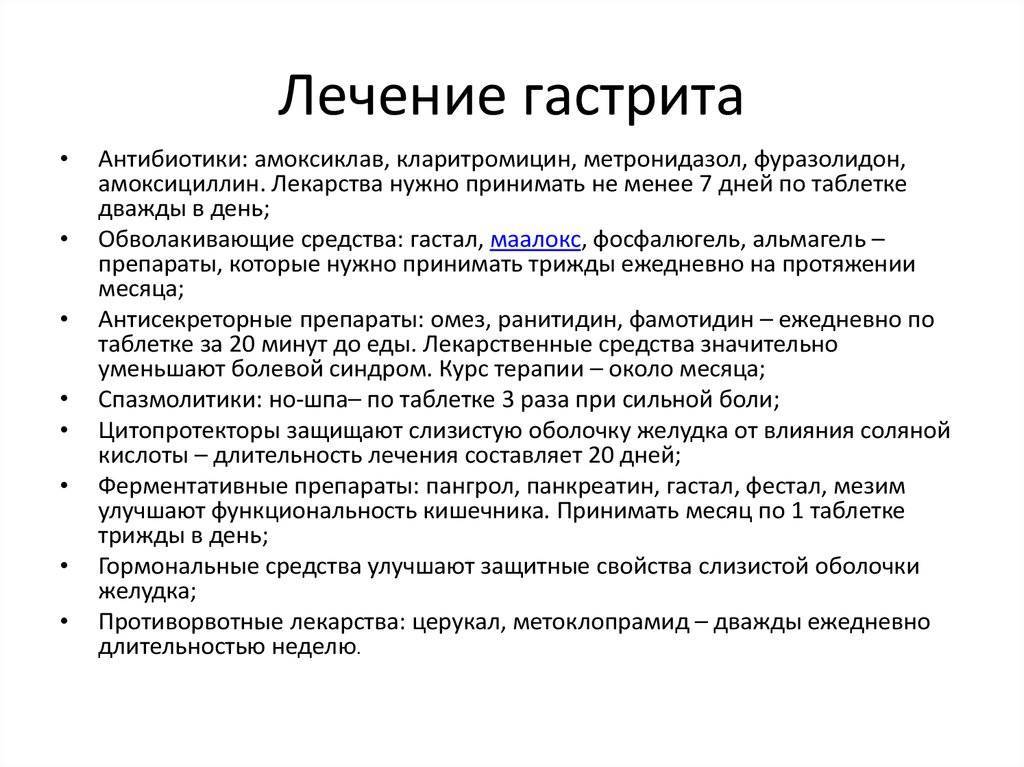 Протоколы лечения гастрита включают комбинации из следующих препаратов: