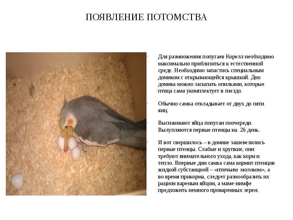 Организовав необходимый климат и повесив гнездовой домик, вы простимулируете размножение корелл. Период спаривания попугаев длится семь-десять дней, в редких случаях – около месяца. Примерно через десять-четырнадцать дней, или чуть позже, появляется первое яичко. Перед тем, как отложить яйцо, самка начинает заметно волноваться, ее дыхание учащается.