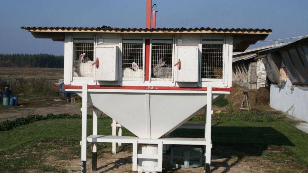 Мини-ферма состоит из трех ярусов, расположенных друг на друге. В нижнем ярусе установлена шахта для отходов, а в верхнем живут кролики и располагаются кормушки и поилки. Стену, смотрящую на север, утепляют и закрывают любые щели, а южную делают решетчатой, чтобы свежий воздух беспрепятственно проходил в клетку.