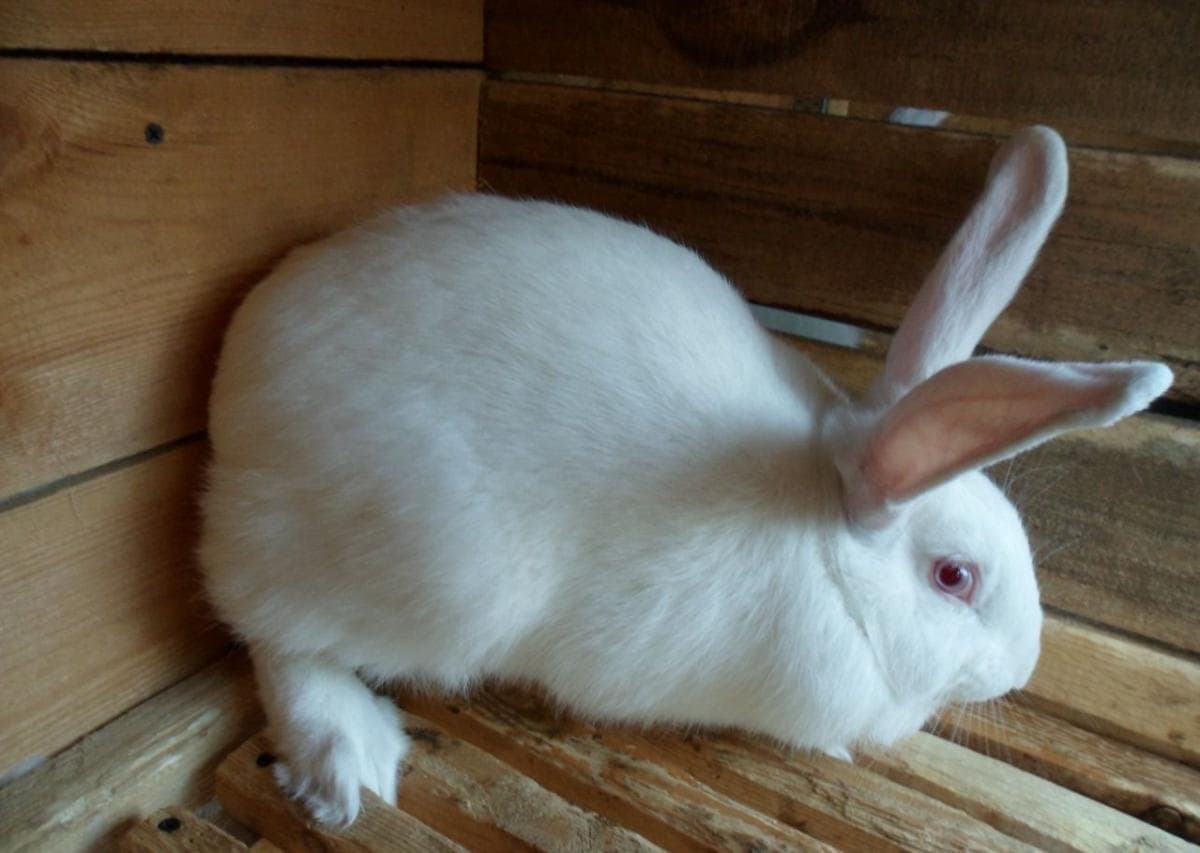 Немного напоминает первую породу: красные глаза, белая густая шерсть и нежный подшерсток… Живая масса такого кролика варьируется между 4 килограммами и 8 килограммами, а доля чистого мяса, пригодного для употребления, составляет не менее чем 75%.