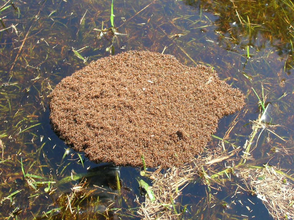 В случае затопления муравейника его обитатели всплывают. В «живом плоту» может быть до 100 тысяч особей. Плот дрейфует и в конечном итоге оказывается на поверхности почвы