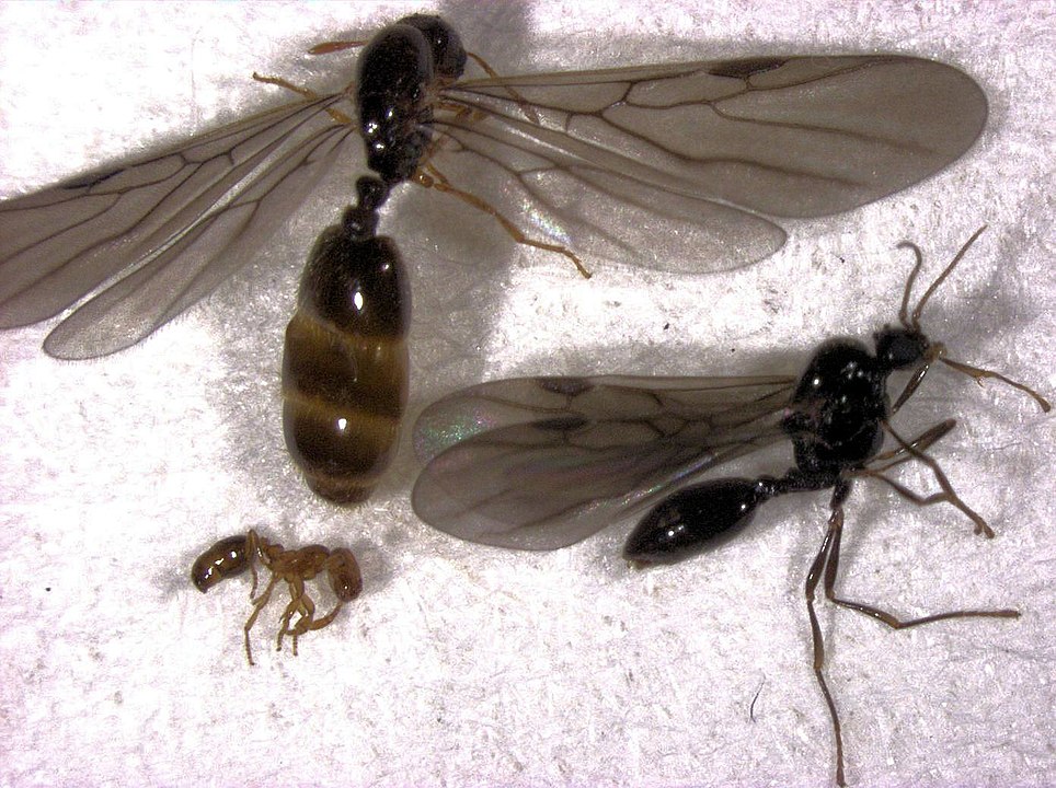 Взрослые члены одного гнезда Solenopsis: маленький рабочий муравей, крылатый самец (черный) и крылатая самка. У крылатых особей хорошо видно, что их стебелек — двухчлениковый