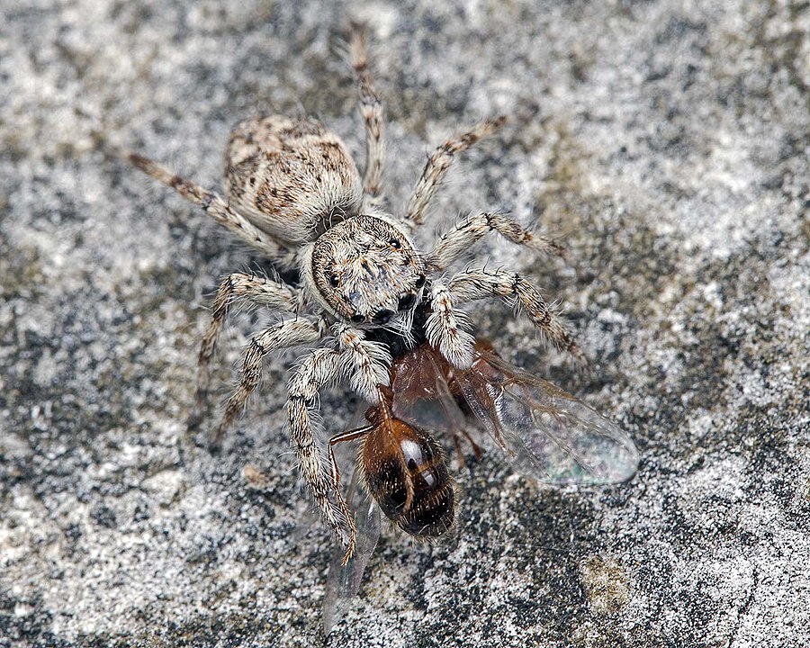 Паук-скакун поймал крылатого муравья, вероятно — самку Solenopsis