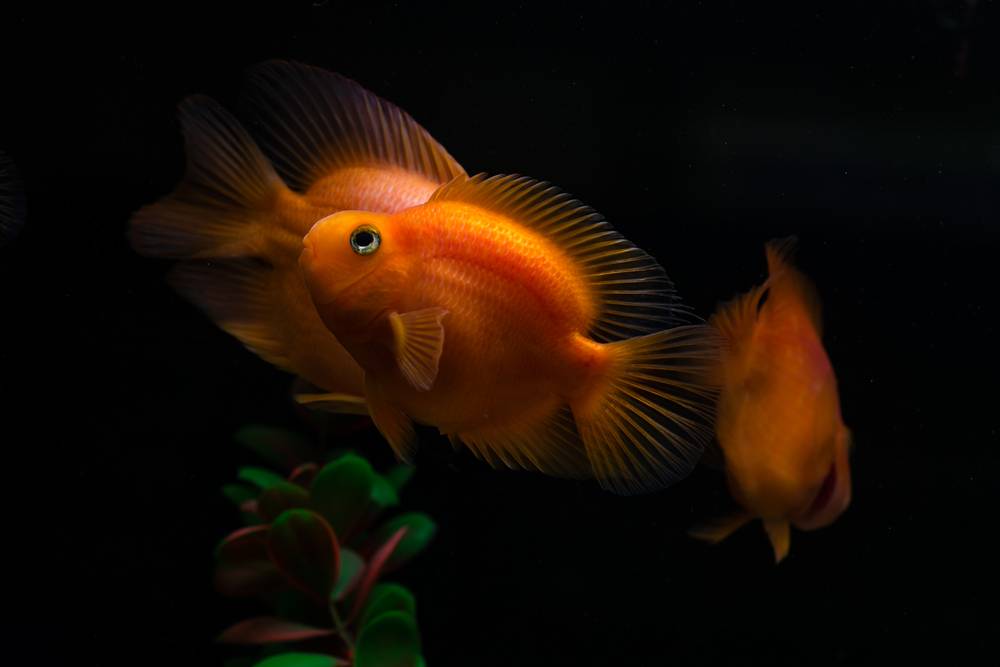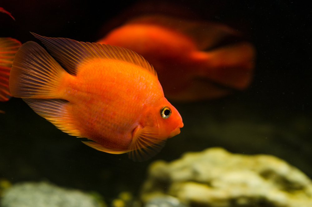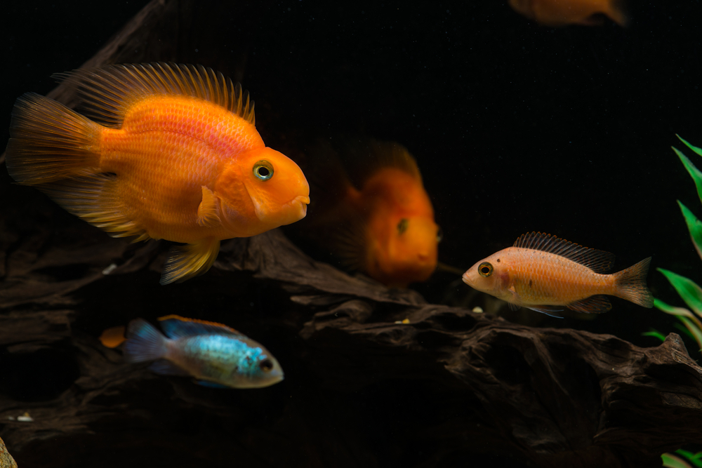 Ухаживая за рыбами попугайчиками, стоит знать, что причина побледнения цвета – пониженная температура или яркое освещение. А выделить яркость окраса поможет тёмный грунт или фон аквариума.