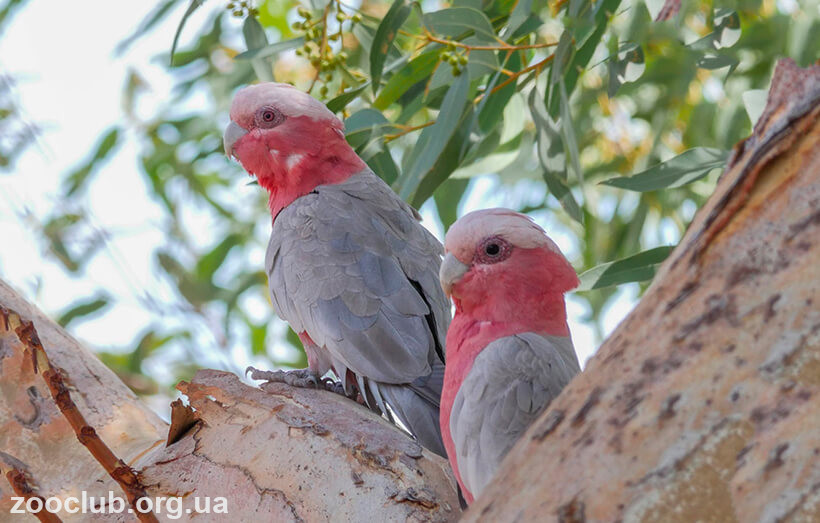 Розовые какаду любят купаться. Во время дождя они повисают на ветках вниз головой, широко распахнув крылья, чтобы струи дождя попали на все тело.
