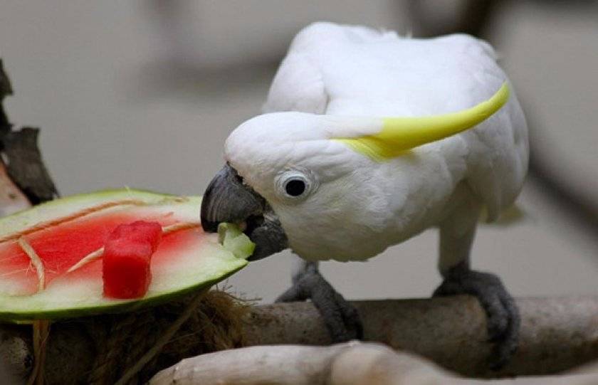Кормят попугаев какаду дважды в день: в кормушку насыпают две чайные ложки зерновой смеси, в отдельной емкости подают измельченные овощи и фрукты. На ночь свежий корм оставлять нельзя, иначе он испортится (есть риск отравления птицы).