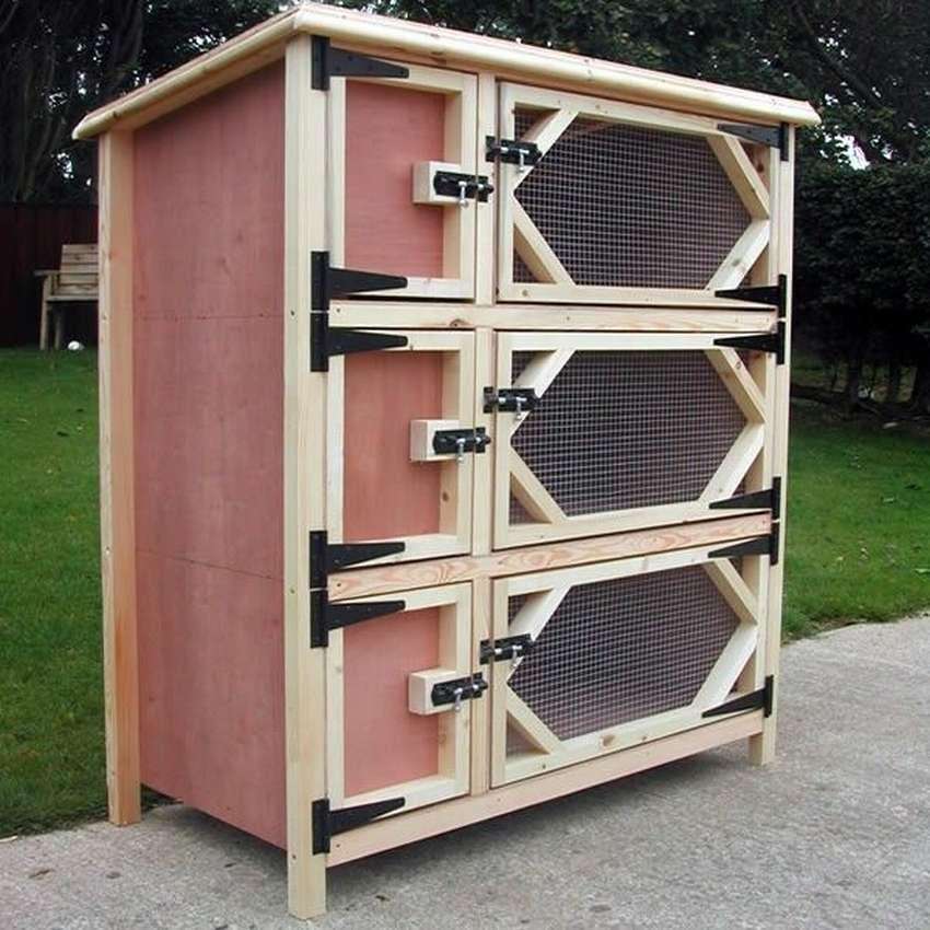 Можно сделать трех- или двухъярусную клетку. Такая конструкция будет несколько сложнее, но таким образом можно сэкономить пространство на своём участке. В клетке необходимо подготовить отдельное место для сна, выгула и еды. Для этого сооружения на расстоянии 15 см от пола разделяются перегородкой из фанеры, которая имеет отверстие 20 на 20 см. Отсек для сна оснащается деревянной дверцей, а место для еды и прогулок — сетчатой.