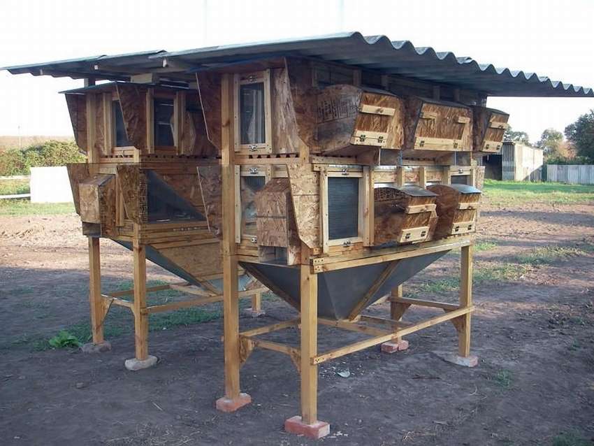 Для массового содержания животных подойдут многоярусные конструкции с двускатной крышей.