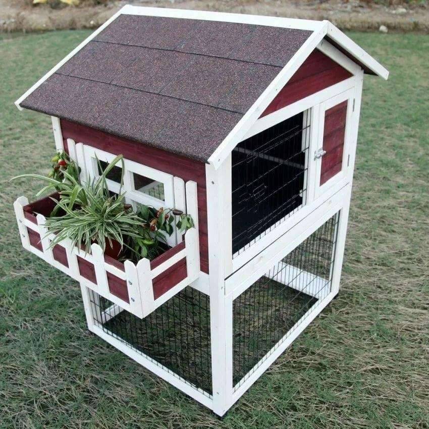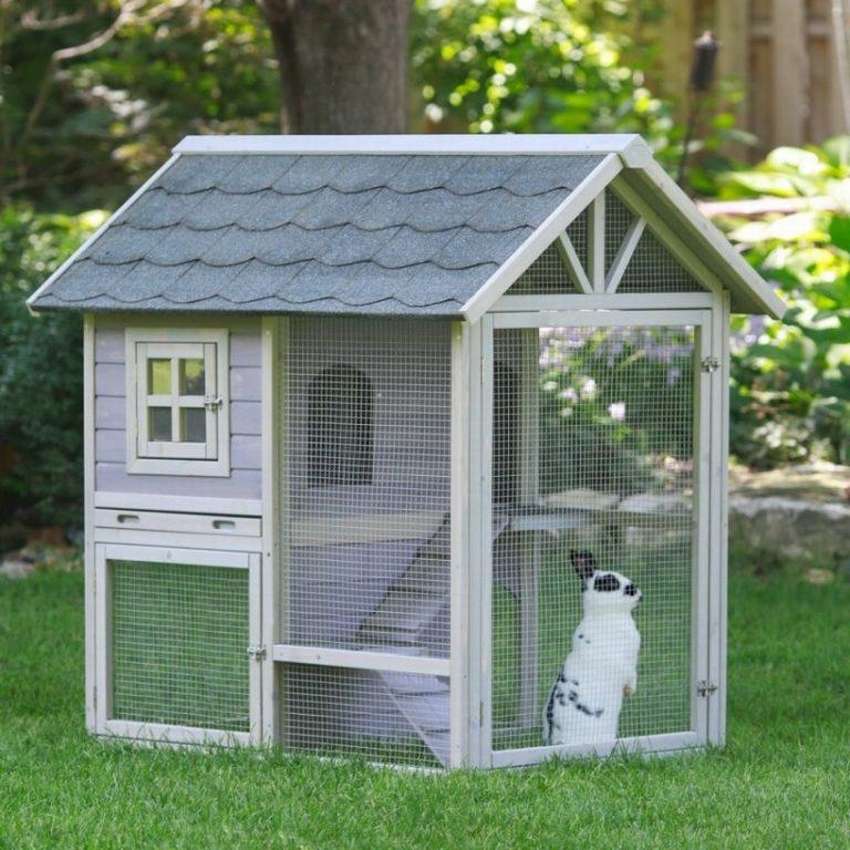 Домик с лесенкой, дверью и окошком. Кролику в нем будет более чем комфортно.