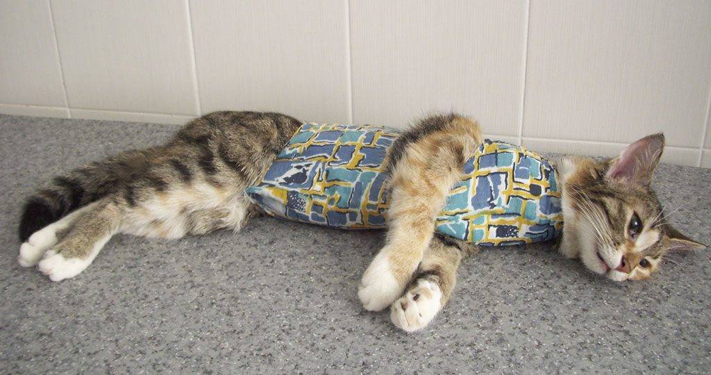 Перевязку лучше делать с помощником, чтобы кошка не убежала и не травмировала себя под диваном или за шкафом с открытым доступом к ране. Нужно снять заднюю часть попоны, полностью не снимайте, потом трудно будет одевать, уберите марлевую салфетку прикрывающую швы. Как выглядит попона на кошке, вы можете увидеть на самой первой фотографии этой статьи.
