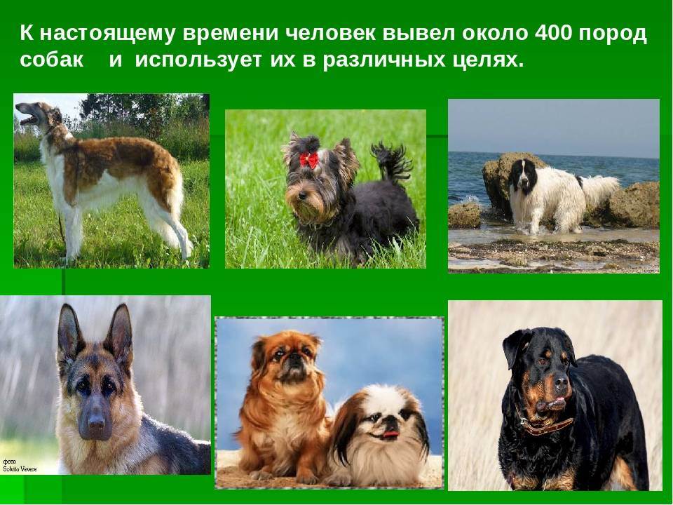 Многие тысячелетия люди отбирали и выводили собак с особыми свойствами. Так появлялись разнообразные породы собак, пригодных для охоты, охраны, военных действий, первозке тяжестей и т. п. Например, уже на египетских памятниках 3400—2100 гг. до н.э. уже были изображения собак разных пород. Большинство из них имели сходство с борзыми. На более поздних памятниках появляются новые породы, схожие с нынешними гончими и таксами. А на ассирийском памятнике 640 г. до н.э. имеется изображение большого мастифа.Работа над новыми породами собак продолжается и в наше время. Совсем недавно, в течении каких-то ста последних лет выведены доберман, пит-буль, стаффордширский терьер, черный терьер, московская сторожевая, московский той-терьер и некоторые другие разновидности. Иногда, для улучшения рабочих качеств собак люди скрещивают их с их родственниками по происхождению: волками, шакалами…