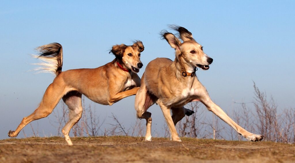 На короткой дистанции салюки может развить скорость до 90 км/час, на длинной – до 70 км/час. Во дворе эти любопытные собаки всегда в поисках дичи – любой мячик, камешек, пакетик будет тщательно изучен и осмотрен. Салюки создана для охоты на открытой местности – в степи, пустыне и др.
