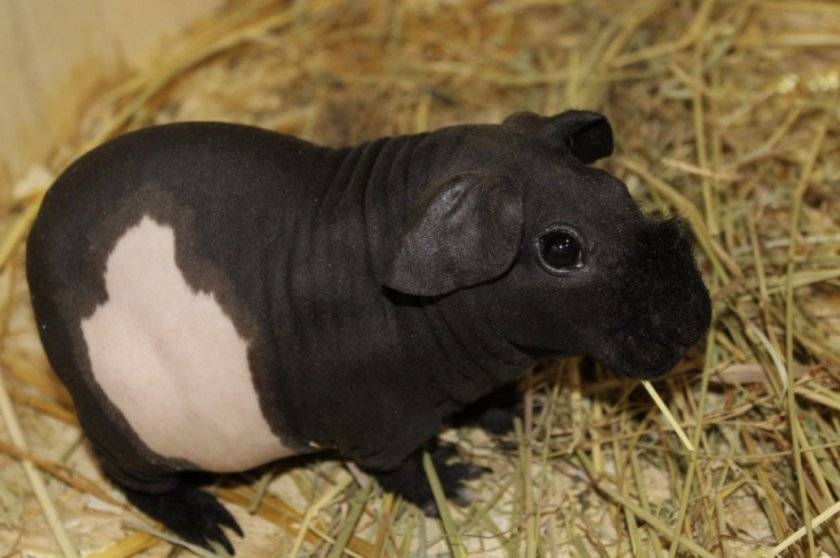 Морские свинки Болдуина полностью лысые и имеют гладкую кожу. Скинни носит мех на носу и ногах от рождения до конца жизни. Основная особенность ухода — соблюдение температурного режима и более разнообразное питание (рацион должен быть более калорийным, чем у других свиней). Подробнее о морских свинках смуф читайте в статье Baldwin Guinea Pig.